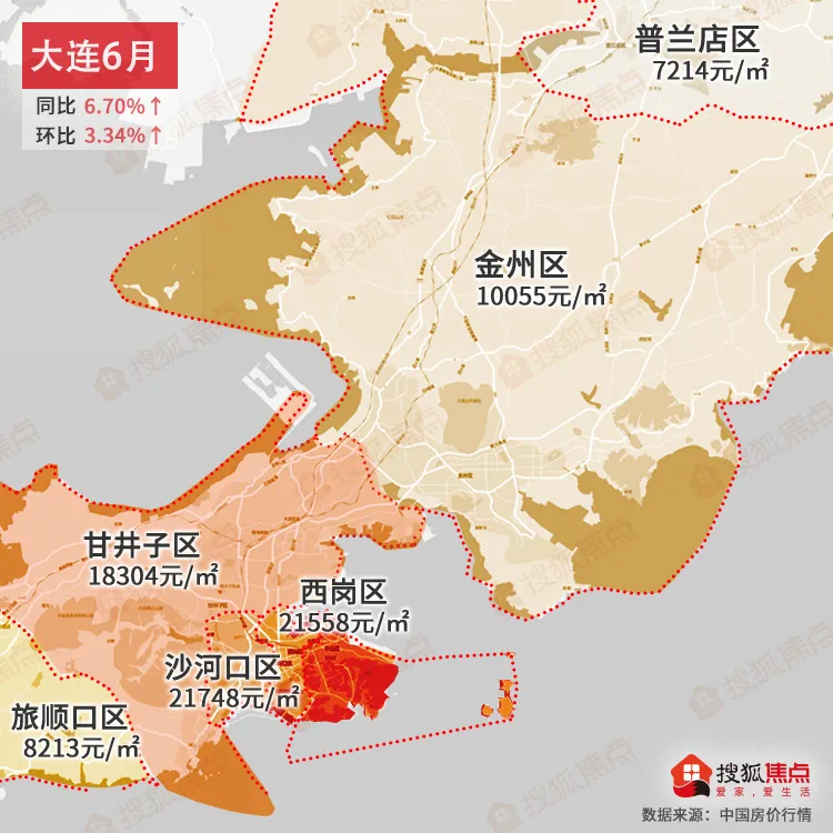 大连6月均价为17342元/㎡,同比上涨6.70%↑,环比上涨3.34%↑