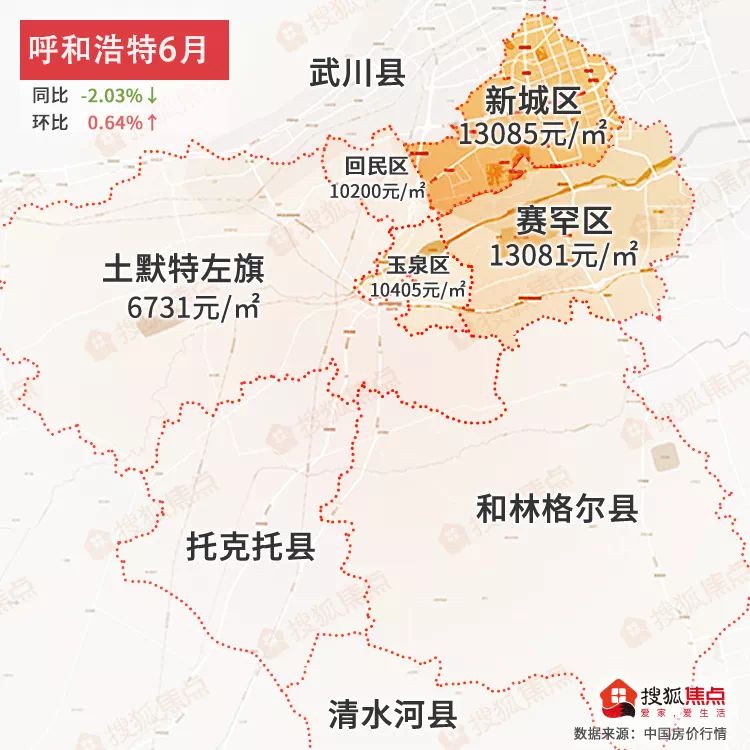 呼和浩特6月均价为11826元/㎡,同比下跌-2.03%↓,环比上涨0.64%↑
