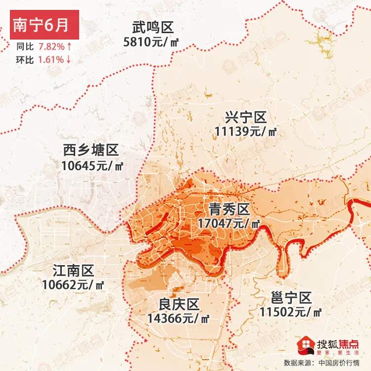 南宁6月均价为13644元/㎡,同比上涨7.82%↑,环比上涨1.61%↑