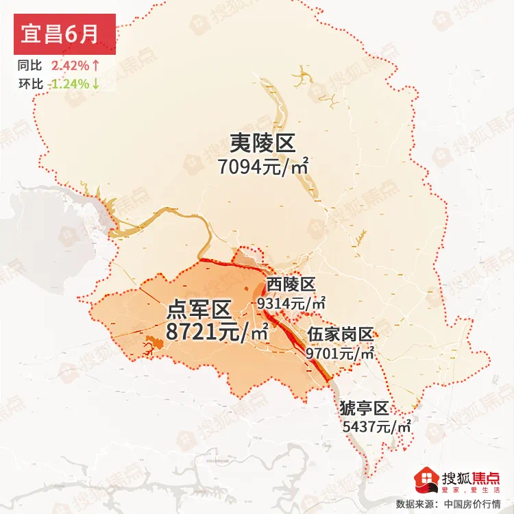 宜昌6月均价为8540元/㎡,同比上涨2.42%↑,环比下跌-1.24%↓