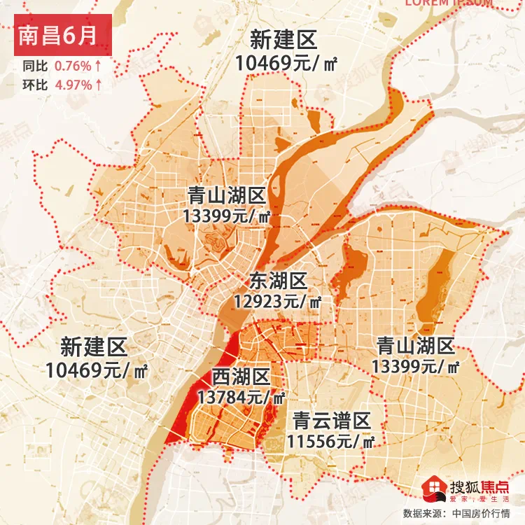 南昌6月均价为12930元/㎡,同比上涨0.76%↑,环比上涨4.97%↑