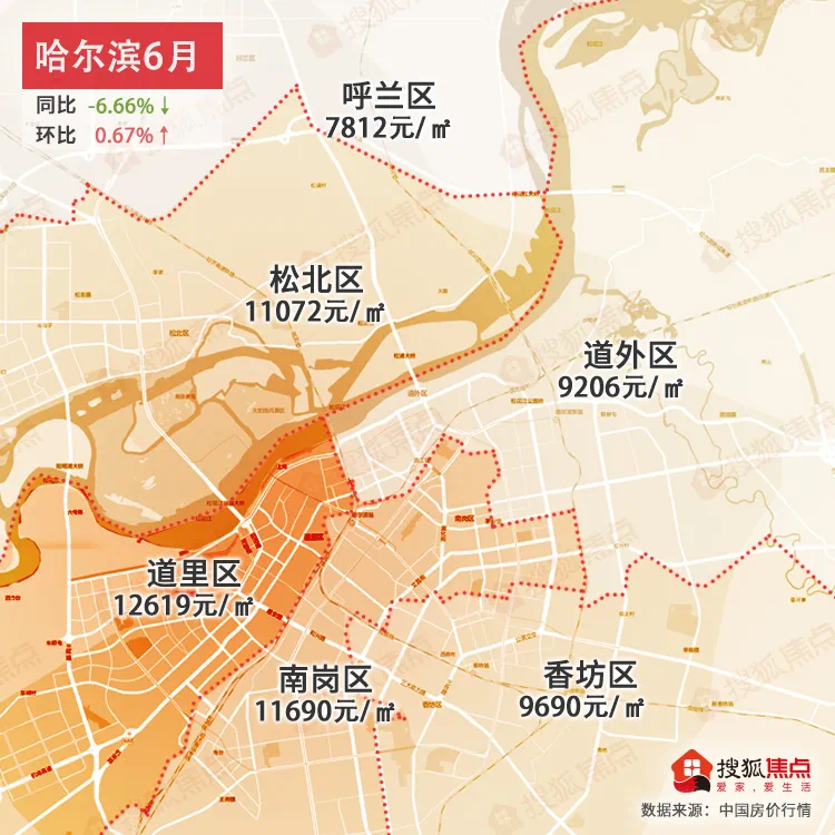 哈尔滨6月均价为10408元/㎡,同比下跌-6.66%↓,环比上涨0.67%↑