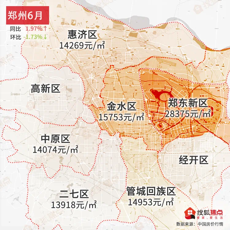 郑州6月均价为14606元/㎡,同比上涨1.97%↑,环比下跌-1.73%↓