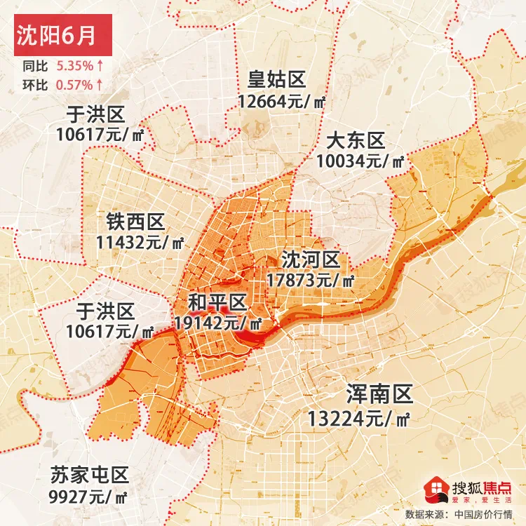 沈阳6月均价为12633元/㎡,同比上涨5.35%↑,环比上涨0.57%↑