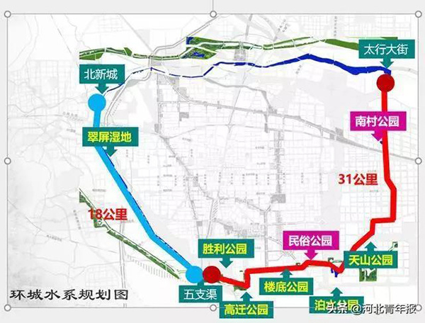 环城水系的基础设施进一步进行了完善。新建连通两岸的景观桥16座,包括振岗路人行桥、五孔桥、仿赵州桥等;对西起107国道,东至太行大街,全长14公里的景观路进行提升改造。新建24公里生态绿道,其中西线(振岗路-红旗大街段)长约8.5公里,砂石路提升为3.5米宽的绿道慢行系统;南线(G107交口至太行大街交口)长约15.5公里,对破损严重的10米宽景观路进行修复。对园路进行修缮,畅通路网,园路建设工程包括环城水系沿线绿地、公园及重要景观节点中的现状园路修缮及新增园路工程,分为车行路及人行路两部分。增设水系内部路网建设,在水系沿线公园内形成闭合路网,并实现景观路与外部路的合理衔接。
