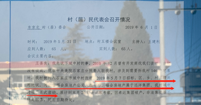 血拼石家庄楼市在东京北村实地了解到,在村务公开栏中张贴的村(居)民代表会召开情况显示,“2019年5月日,招标区、乡、村三级共用比试,河北省福会房地产公司入围中标,福会房地产属于远洋集团,我村城中村项目正式启动。”但此次开发主体的确定,依然没能让东京北村改造顺利进行。
