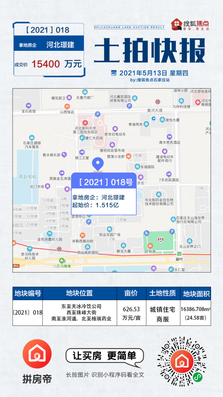 搜狐焦点“焦点地评线”报道:5月13日,高新区迎来一场土地出让活动,涉及一宗城镇住宅、商服用地,地块编号为〔2021〕018号,占地面积为16386.708平方米(约合24.58亩)。据了解,该宗地为大天力地块。最终,〔2021〕018号地由河北璟建房地产开发有限公司以15400万元竞得。