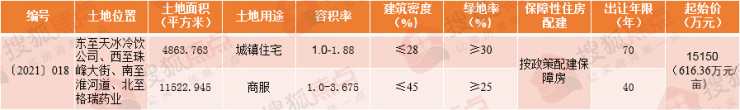 〔2021〕018号地块,位于东至天冰冷饮公司、西至珠峰大街、南至淮河道、北至格瑞药业,面积为16386.708平方米(约合24.58亩),其中,城镇住宅用地面积为4863.763平方米(约合7.29亩),商服用地面积为11522.945平方米(约合17.28亩),出让年限为70年、40年,起始价为15150万元(616.36万元/亩)。