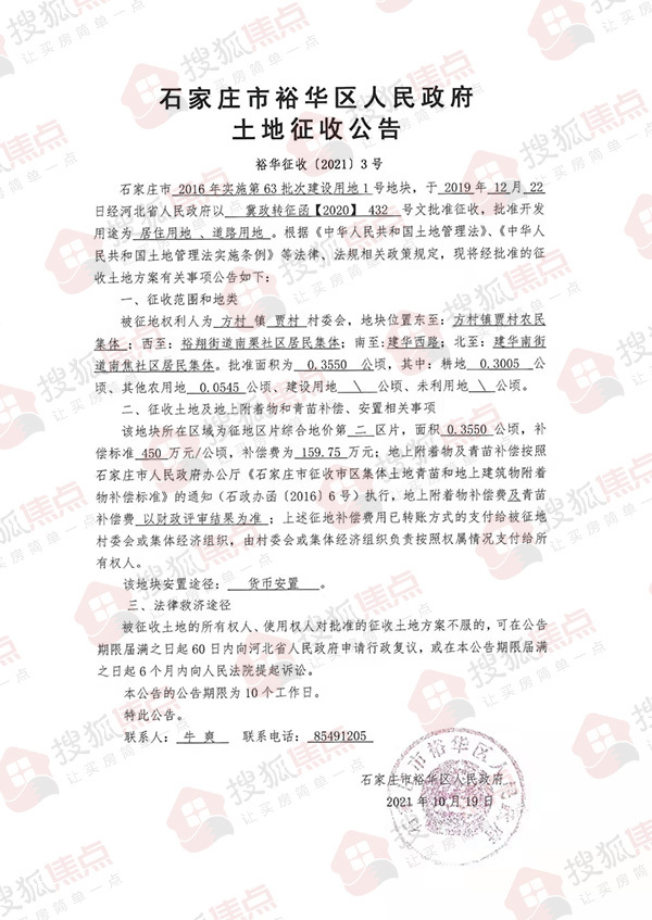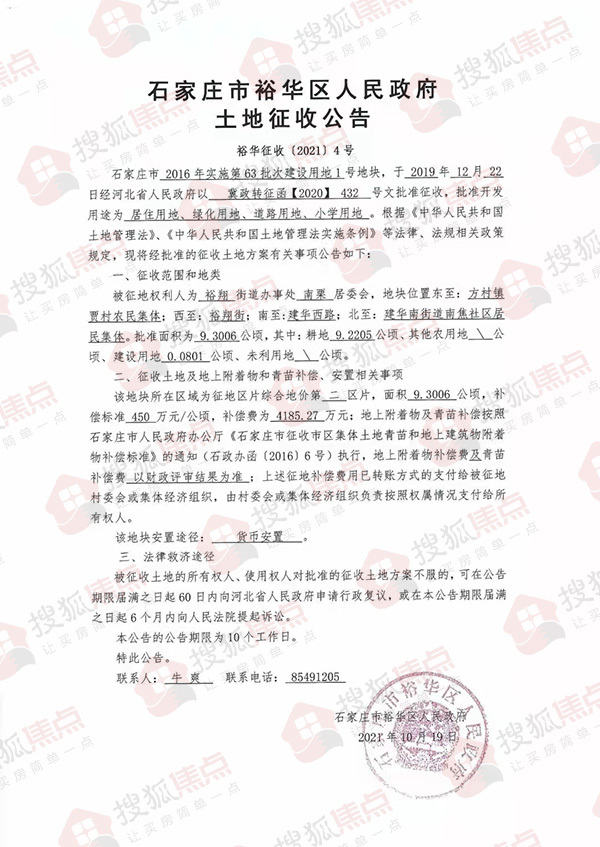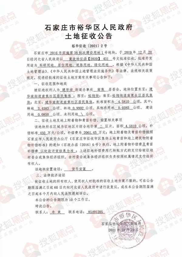 搜狐焦点“楼市快讯”报道:10月22日,搜狐焦点获悉,裕华区政府网站发布了三则征地公告,拟征收南焦、贾村、南栗共计213.549亩土地,批准开发用途为居住用地、道路用地,科研用地、绿化用地、小学用地。