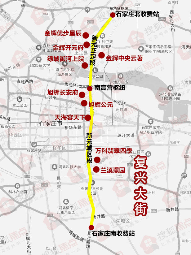 在复兴大街城区段,分布着旭辉长安府、旭辉公元、天海容天下、万科翡翠四季、兰溪璟园,在复兴大街正定段分布有绿城御河上院、金辉中央云著、金辉开元府、金辉优步星辰等。