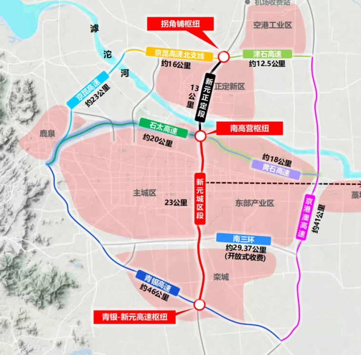 正定段北起石家庄北收费站,南至南高营立交,路线全长12.6km,全线共4处互通立交,将改造为城市快速路,设计速度每小时100km,辅路采用双向4车道,设计速度每小时60km。