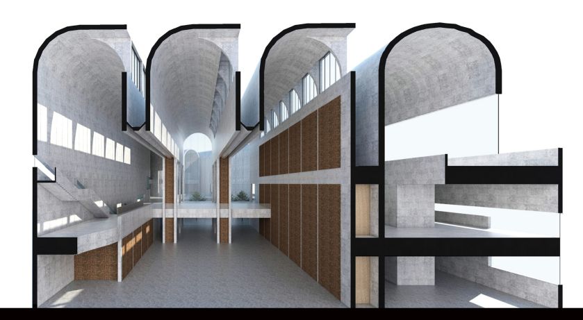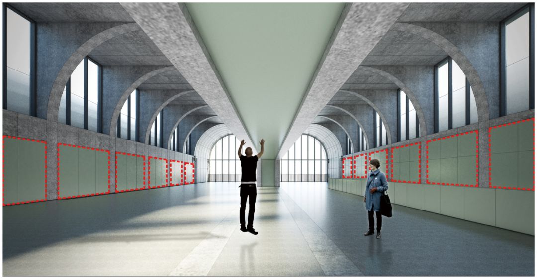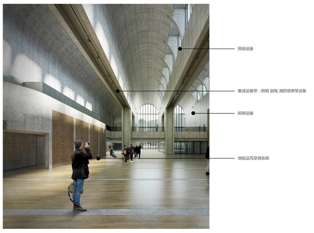 共享空间及拱下空间,布展控制在一定高度内,不破坏清水混凝土拱顶的构成空间,结合自然光线进行静态展示,营造宁静素雅的的展示氛围。
