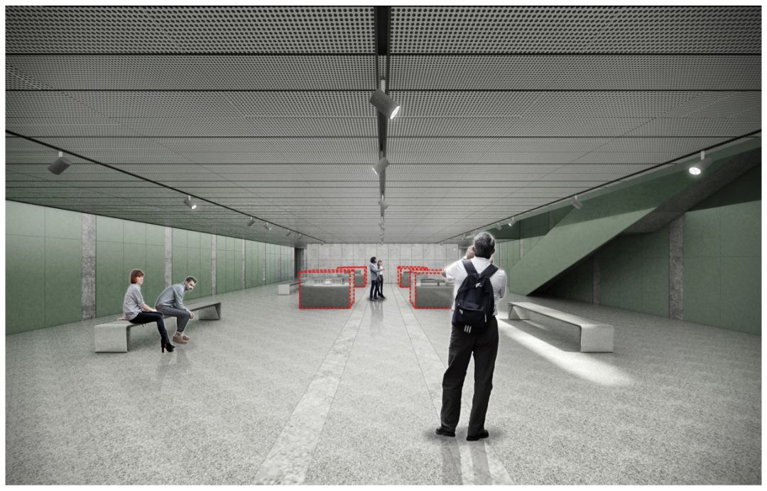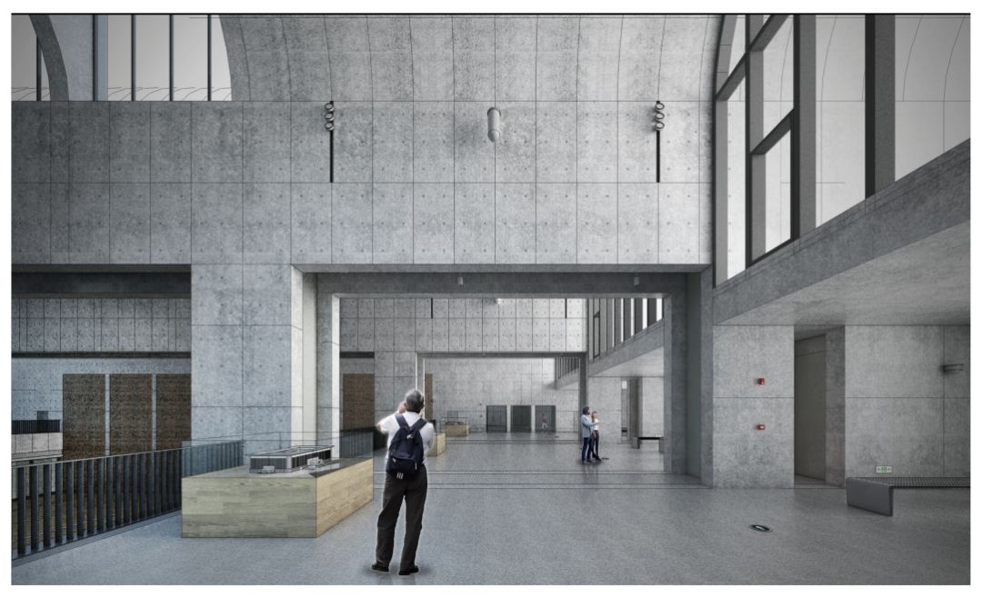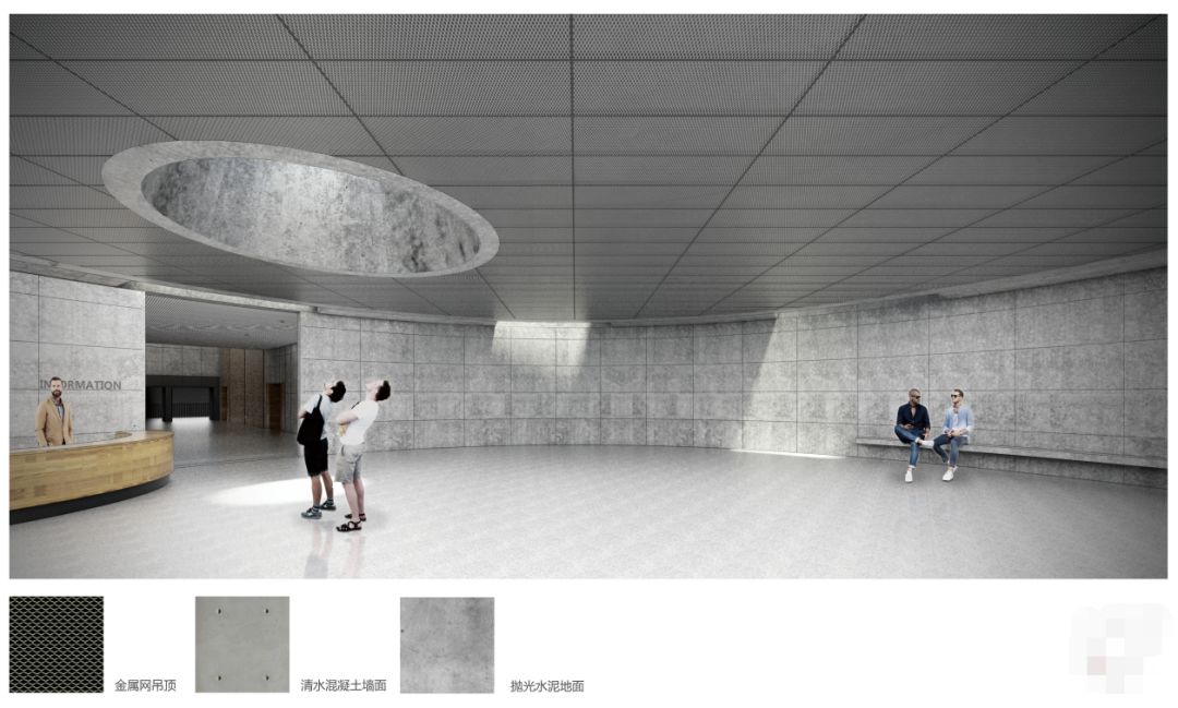 实物模型等展示沿厅中间布局,以减少对清水混凝土墙面影响。