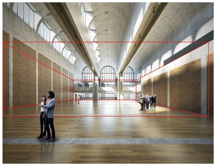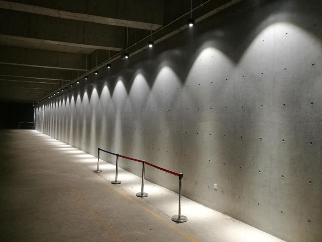 清水墙上一定间隔设置了铝板饰面,墙面展示以结合铝板展示为主,避免了对清水混凝土的破坏。