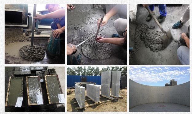 清水混凝土一次浇筑成型,不做二次装饰或进行简单修饰,对混凝土配合比要求较高。结合石家庄当地材料,项目部进行了多次配合比试验,最终确定了较佳配合比,保证了良好的混凝土工作性能。