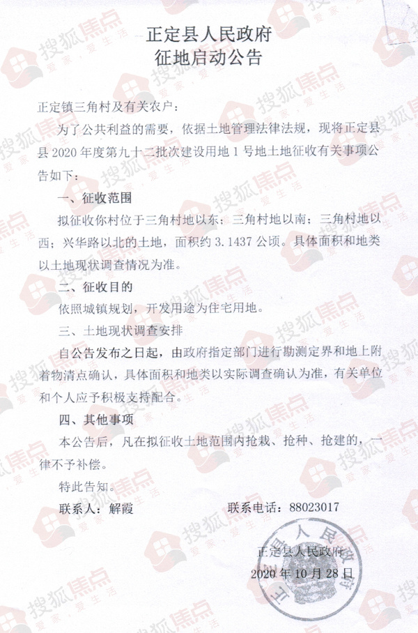 正定县人民政府发布1则征地公告,涉及正定镇三角村。