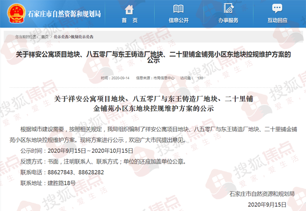搜狐焦点“楼市快讯”报道:近日,搜狐焦点获悉,石家庄市自然资源和规划局发布了《关于祥安公寓项目地块、八五零厂与东王铸造厂地块、二十里铺金铺苑小区东地块控规维护方案的公示》。