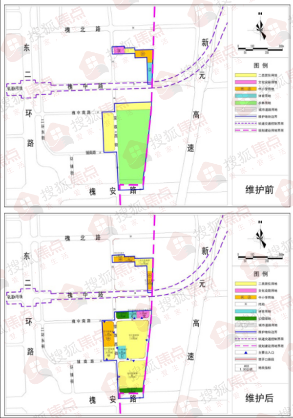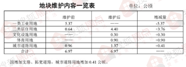 该地块维护后,一类工业用地减少5.37公顷(约合80.55亩),二类居住用地增加3.76公顷(约合56.4亩),文化设施用地增加0.3公顷(约合4.5亩),体育用地增加0.9公顷(约合13.5亩),城市道路用地增加0.41公顷(约合6.15亩)。