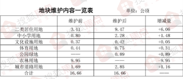 该地块维护后,二类居住用地增加6.06公顷(约合90.9亩),中小学用地增加1.48公顷(约合22.2亩),文化设施用地增加0.05公顷(约合0.75亩),体育用地增加0.31公顷(约合4.65亩),公园绿地增加0.89公顷(约合13.35亩),农林用地减少9.95公顷(约合149.25亩),城市道路用地增加1.16公顷(约合17.4亩)。