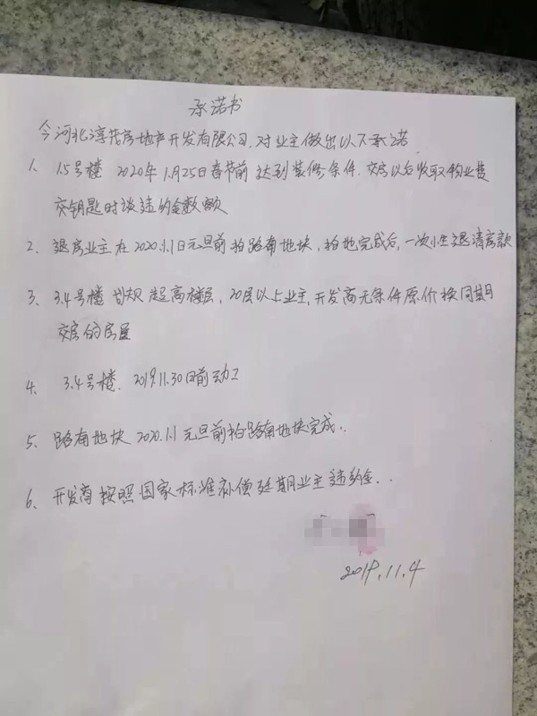 之后业主再次找到开发商,经过沟通,2019年11月4日,开发商再次做出承诺。