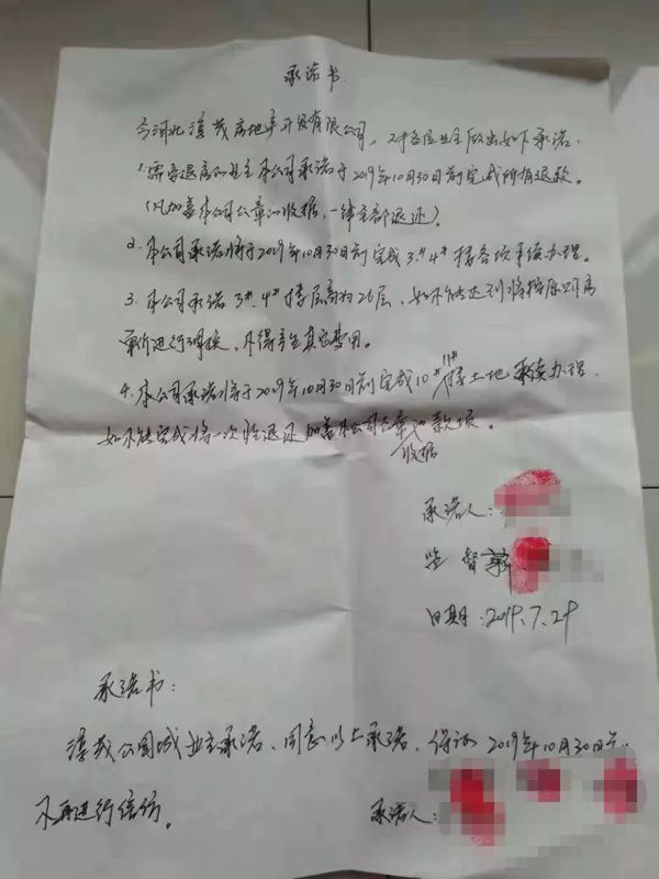 在相关部门指示下,2019年7月29日,淳茂公园城开发商与业主代表互相做了承诺。