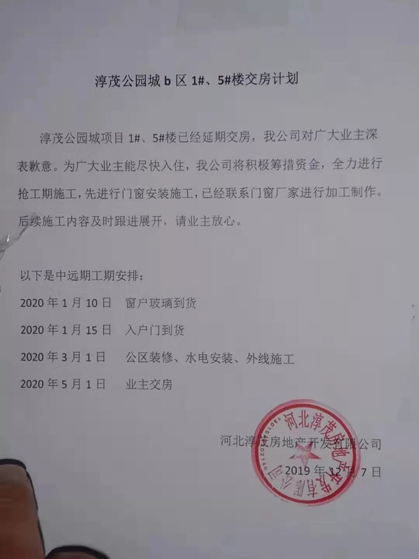 紧接着,2019年12月7日,开发商再次发了一份关于1#、5#楼的交房计划说明书,针对这个计划,康先生表示他们已经不再相信开发商做出的任何承诺。