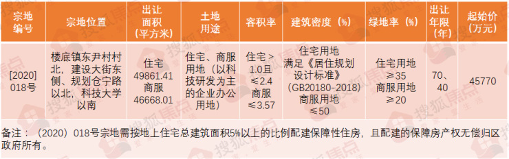[2020]018号地块,位于楼底镇东尹村村北,建设大街东侧、规划仓宁路以北,科技大学以南,总面积为96529.42平方米(约合144.79亩),土地用途为住宅、商服用地,住宅容积率1.0>且≤2.4,商服容积率≤3.57,出让年限为70年、40年,起始价为45770万元。