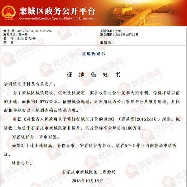 近日,搜狐焦点从栾城区政务公开平台获悉,国土局发布一则征地告知书。