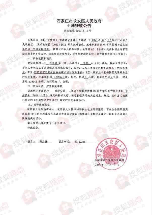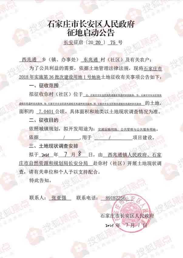 搜狐焦点“楼市快讯”报道:7月5日,搜狐焦点获悉,石家庄市长安区人民政府发布了两则征地公告,拟征收长安区西兆通乡东兆通村和东庄村共约9.0147公顷(约合135.2205亩)土地,批准用途为交通运输用地、公共管理与公共服务用地。