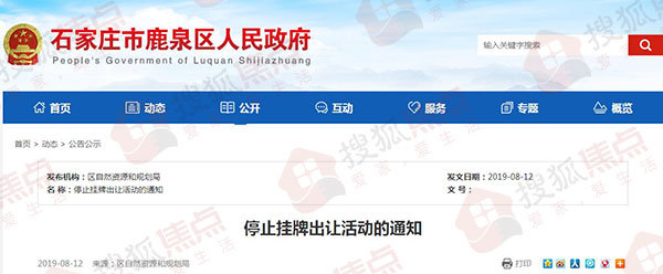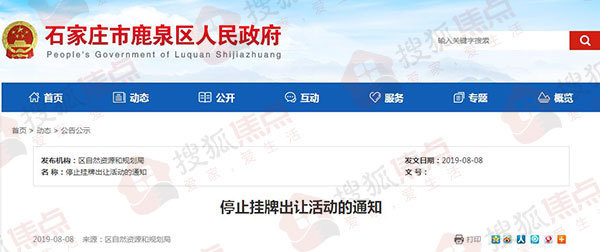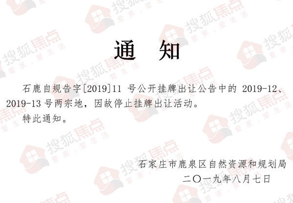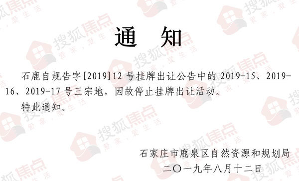 搜狐焦点“焦点地评线”报道:8月12日,搜狐焦点从鹿泉区人民政府网站获悉,此前于2019年7月30日公告的2019-15、2019-16以及2019-17号地块公开出让活动,因故暂停。