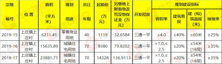 2019-17号地块,该地块位于上庄镇上庄村,土地面积为23881.71平方米(约35.82亩),土地用途为城镇住宅用地,起始价为14328万元,容积率>1.0≤2.5,建筑密度≤20%,绿化率≥35%,出让年限70年。