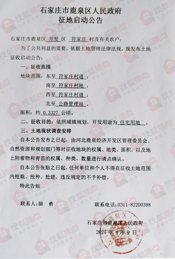 搜狐焦点“楼市快讯”报道:4月12日,搜狐焦点获悉,鹿泉区发布了一则征地启动公告,拟征收鹿泉开发区符家庄村0.3327公顷(约合4.99亩)土地,开发用途为住宅用地。