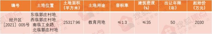 经开区[2021]005号地块,位于东临郭庄村地,西临郭庄村地,南临工业路,北临郭庄村地。面积为25317.96平方米(约合37.98亩),土地用途为教育用地,出让年限为50年,起始价为2030万元。