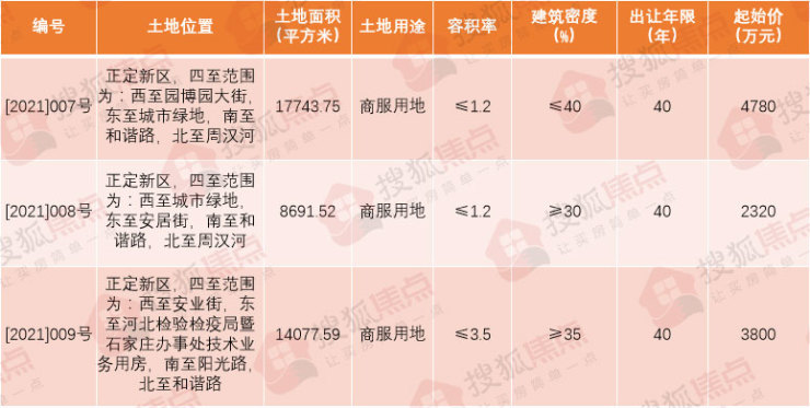 [2021]009号地块,正定新区,四至范围为:西至安业街,东至河北检验检疫局暨石家庄办事处技术业务用房,南至阳光路,北至和谐路。面积为14077.59平方米(约合21.12亩),土地用途为商服用地,出让年限为40年,起始价为3800万元。