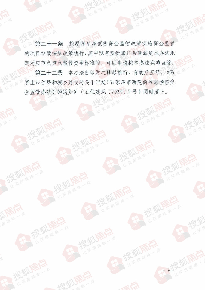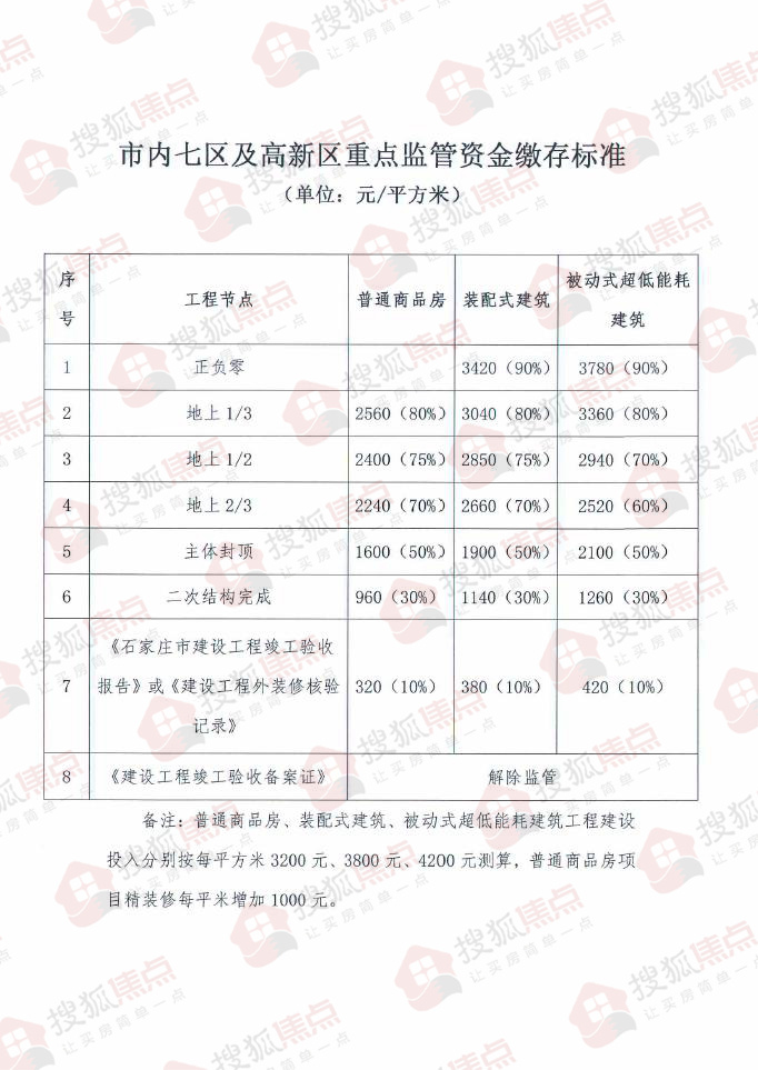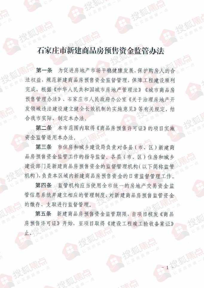 搜狐焦点“楼市快讯”报道:1月28日,搜狐焦点获悉,石家庄市住房和城乡建设局发布了关于《石家庄市新建商品房预售资金监管办法》的通知,并公布了市内七区及高新区重点监测资金缴存标准。