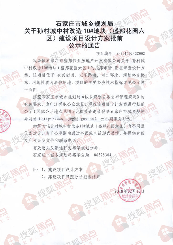 搜狐焦点从石家庄市城乡规划局获悉,《关于孙村城中村改造10#地块(盛邦花园六区)建设项目设计方案批前公示的通告》正式发布。