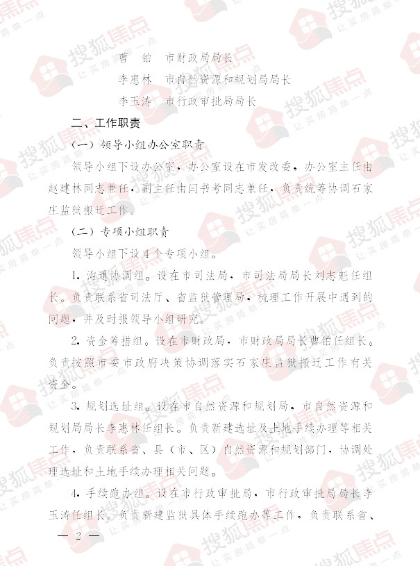 搜狐焦点“楼市快讯”报道:1月18日,搜狐焦点获悉,石家庄市人民政府网站发布了关于成立石家庄监狱搬迁工作领导小组的通知。通知显示,为加大石家庄监狱搬迁工作推进力度,圆满完成工作任务,结合工作实际,现成立石家庄监狱搬迁工作领导小组。领导小组下设沟通协调组;资金筹措组;规划选址组,负责新建选址及土地手续办理等相关工作;手续跑办组。要求各工作组和成员单位由领导小组直接管理,分工负责各项工作谋划开展,制定具体推进方案和实施措施,细化分解任务,逐项明确具体安排、推进重点和时间进度,推动搬迁工作有序实施。