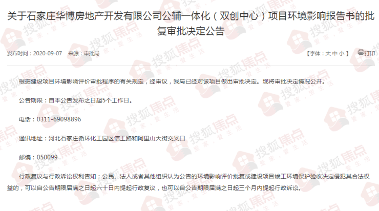 搜狐焦点“楼市快讯”报道:9月8日,搜狐焦点获悉,石家庄循环化工园区发布了《关于石家庄华博房地产开发有限公司公辅一体化(双创中心)项目环境影响报告书的批复审批决定公告》。