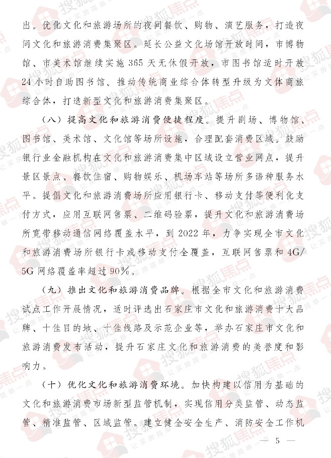 通知显示,力争到2022年,全市居民文化娱乐支出稳步增长,占消费支出的比例不断提升;全市旅游收入增速保持两位数以上增长,争创国家文化和旅游示范城市。从规划、土地、资金、金融、交通等方面加强对文化和旅游消费的支持力度;打造2-3条文旅商街;构建园区、街区、社区“三区一体”“三区联动”的文化和旅游消费新格局;高质量举办石家庄市旅游产业发展大会,推出一个全域旅游品牌、打造一批精品旅游片区、建设一批重点旅游项目、催生一批旅游新兴业态;培育旅游民宿;推动传统商业综合体转型升级为文体商旅综合体等。