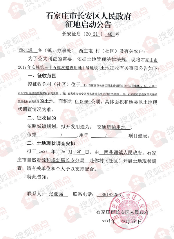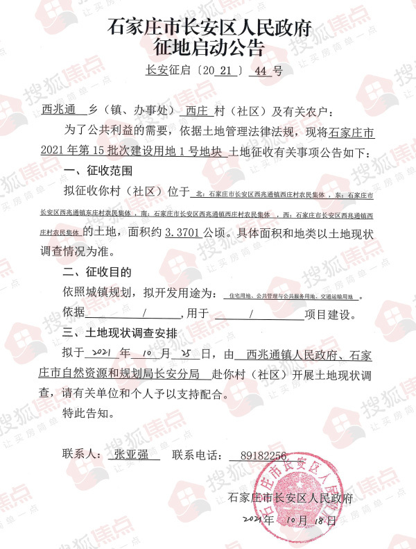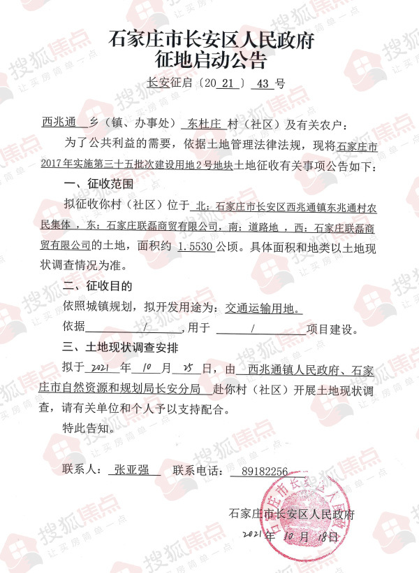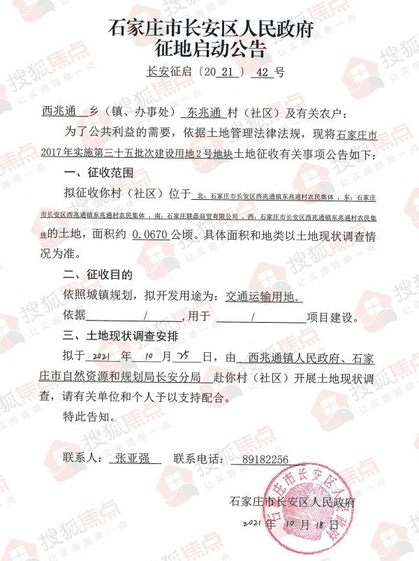 搜狐焦点“楼市快讯”报道:10月21日,搜狐焦点获悉,长安区政府网站发布了4则征地启动公告,拟征收西庄屯村、东杜庄村、西庄村、东兆通村共计74.955亩土地,开发用途为住宅用地、公共管理与公共服务用地、交通运输用地。