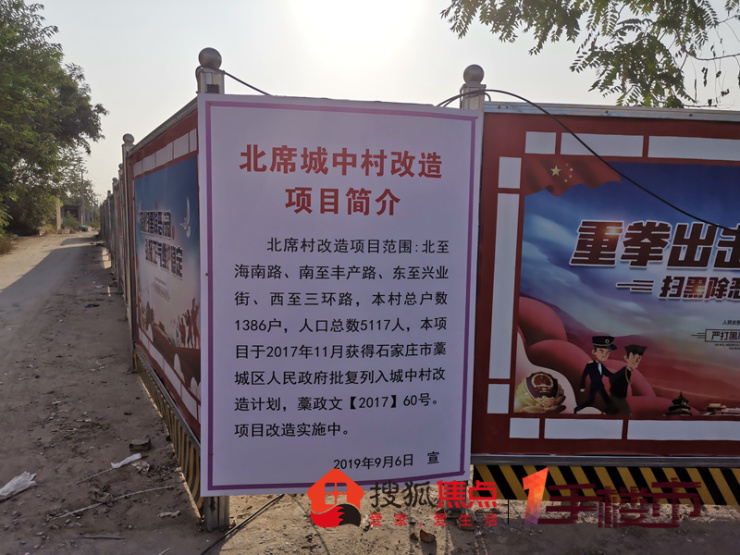 在北席村旧村,搜狐焦点看到有关北席城中村改造的项目介绍,据了解,该城中村改造北至南海路、南至丰产路、东至兴业街、西至三环路,北席村总户数1386户,人口总数达5117人,该项目于2017年11月获得石家庄市藁城区人民政府批复列入城中村改造计划,项目改造实施中。