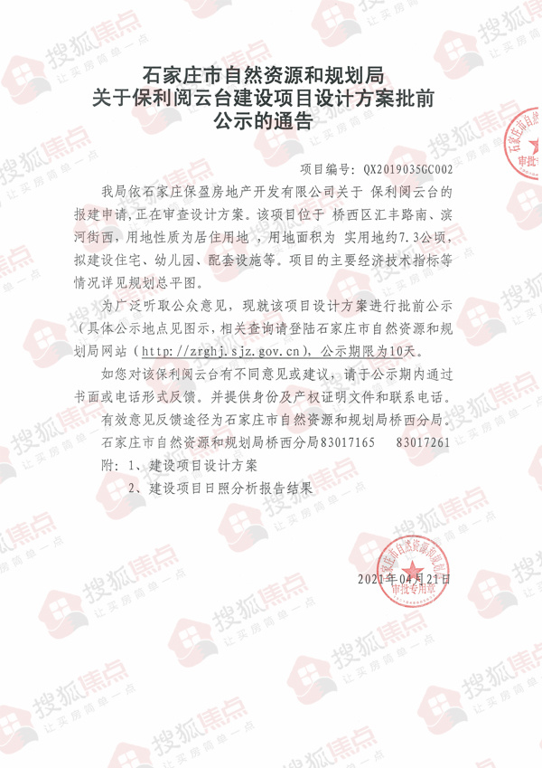 石家庄市自然资源和规划局发布了关于保利阅云台建设项目设计方案批前公示的通告。