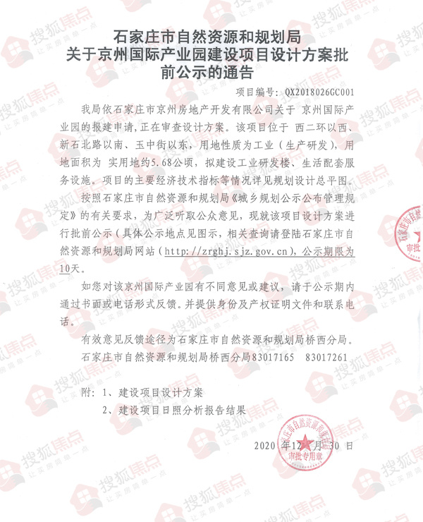 搜狐焦点“楼市快讯”报道:12月31日,搜狐焦点获悉,石家庄市自然资源和规划局发布了《关于京洲国际产业园建设项目设计方案批前公示的通告》。