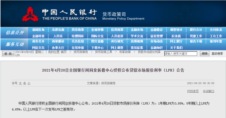 4月20日消息,搜狐焦点获悉,中国人民银行授权全国银行间同业拆借中心公布,2021年4月贷款市场报价利率(LPR)为:1年期LPR为3.85%,5年期以上LPR为4.65% ,两个期限品种报价均与上个月持平。
