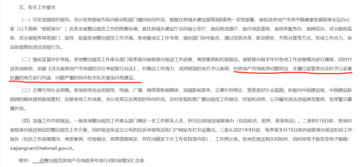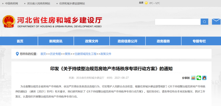 河北省2021年8月,河北省住建厅联合八部门启动持续整治规范房地产市场秩序专项行动,对房企违法违规开工建设,未按施工图开发建设,未按房屋买卖合同如期交付,存在房屋渗漏、开裂、空鼓质量问题,以及未按完整居住社区建设标准建设配套设施等违规行为进行专项打击。