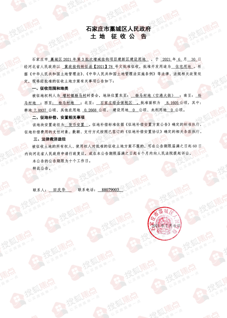 具体来看,拟征收增村镇杨马村位于东至杨马村地(空港大街);南至杨马村地;西至杨马村地;北至石家庄综合保税区的土地,征收土地面积为8.1605公顷(约合122.4075亩)。依照城镇规划,开发用途为住宅用地。该地块安置途径为货币安置。