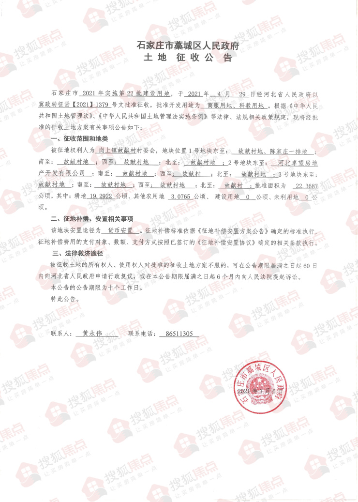 搜狐焦点“楼市快讯”报道:7月6日,搜狐焦点获悉,石家庄市藁城区人民政府发布了两则征地公告,拟征收增村镇杨马村和岗上镇故献村共约30.5292公顷(约合457.938亩)土地,批准用途为住宅用地、商服用地、科教用地。