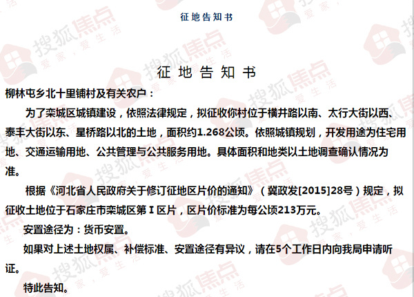 搜狐焦点“楼市快讯”报道:3月26日,搜狐焦点从栾城区政务公开平台了解,栾城区自然资源和规划局发布了一则征地公告,拟征收柳林屯乡北十里铺村1.268公顷(19.02亩)土地。