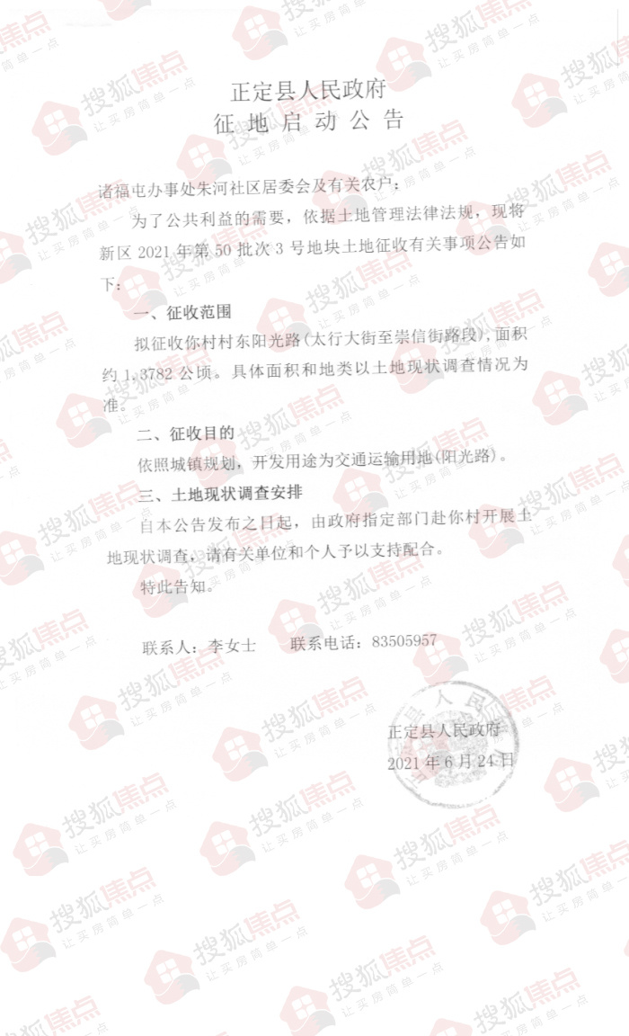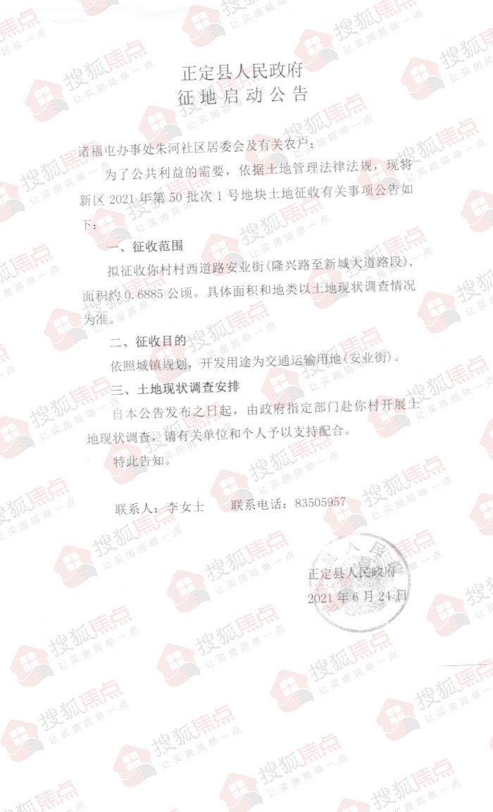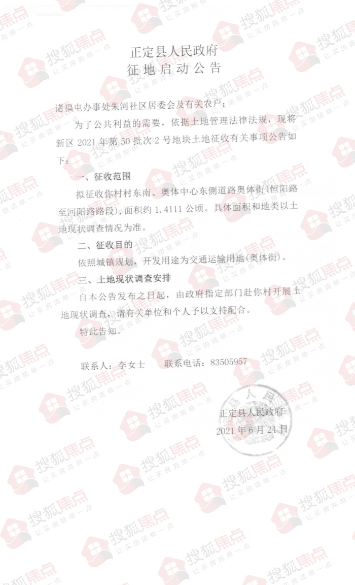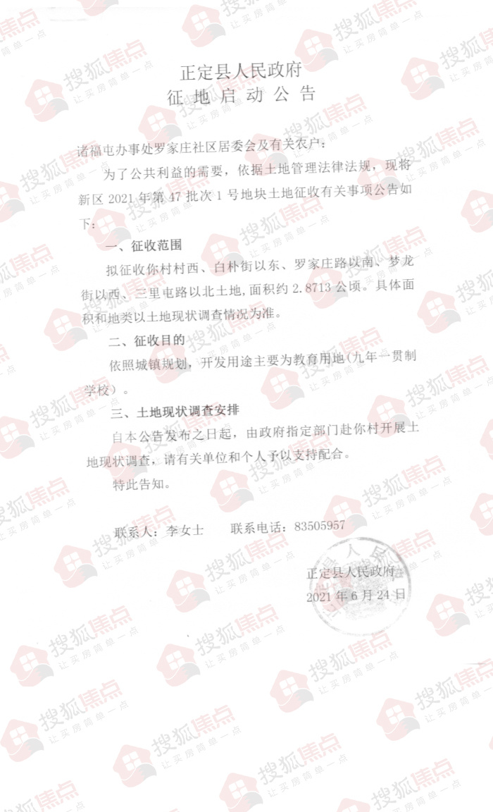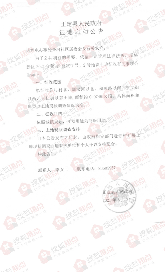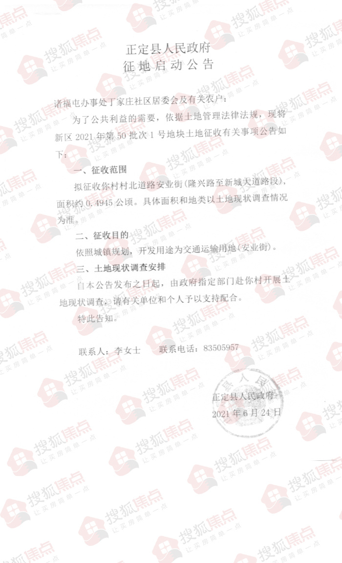 搜狐焦点“楼市快讯”报道:6月25日,搜狐焦点获悉,石家庄市正定县人民政府发布了六则土地征收公告,拟征收诸福屯办事处丁家庄、朱河、罗家庄共计约7.8155公顷(约合117.2325亩)土地,开发用途为交通运输用地、商服用地、教育用地等。