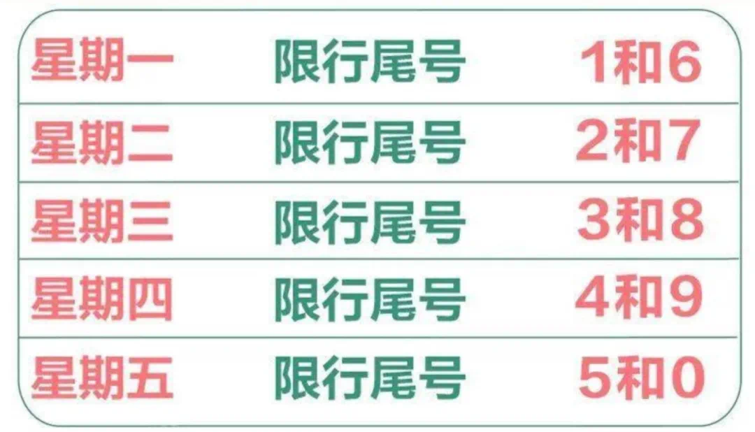 (二)自2021年7月5日至2021年10月3日,星期一至星期五限行机动车车牌尾号分别为:1和6、2和7、3和8、4和9、5和0;